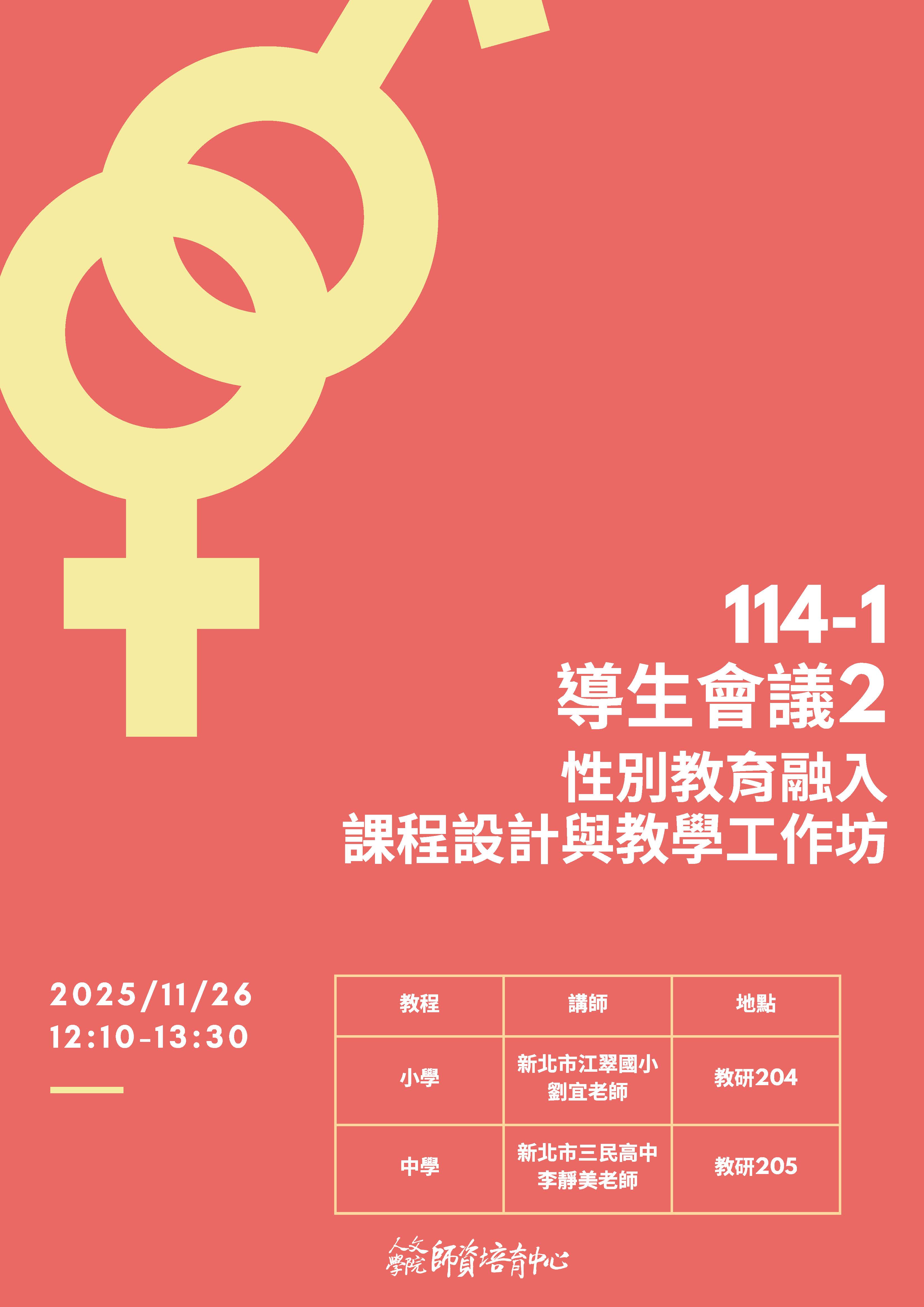時間:114.11.26(三)12:10-13:30【性別教育融入課程設計與教學工作坊】
