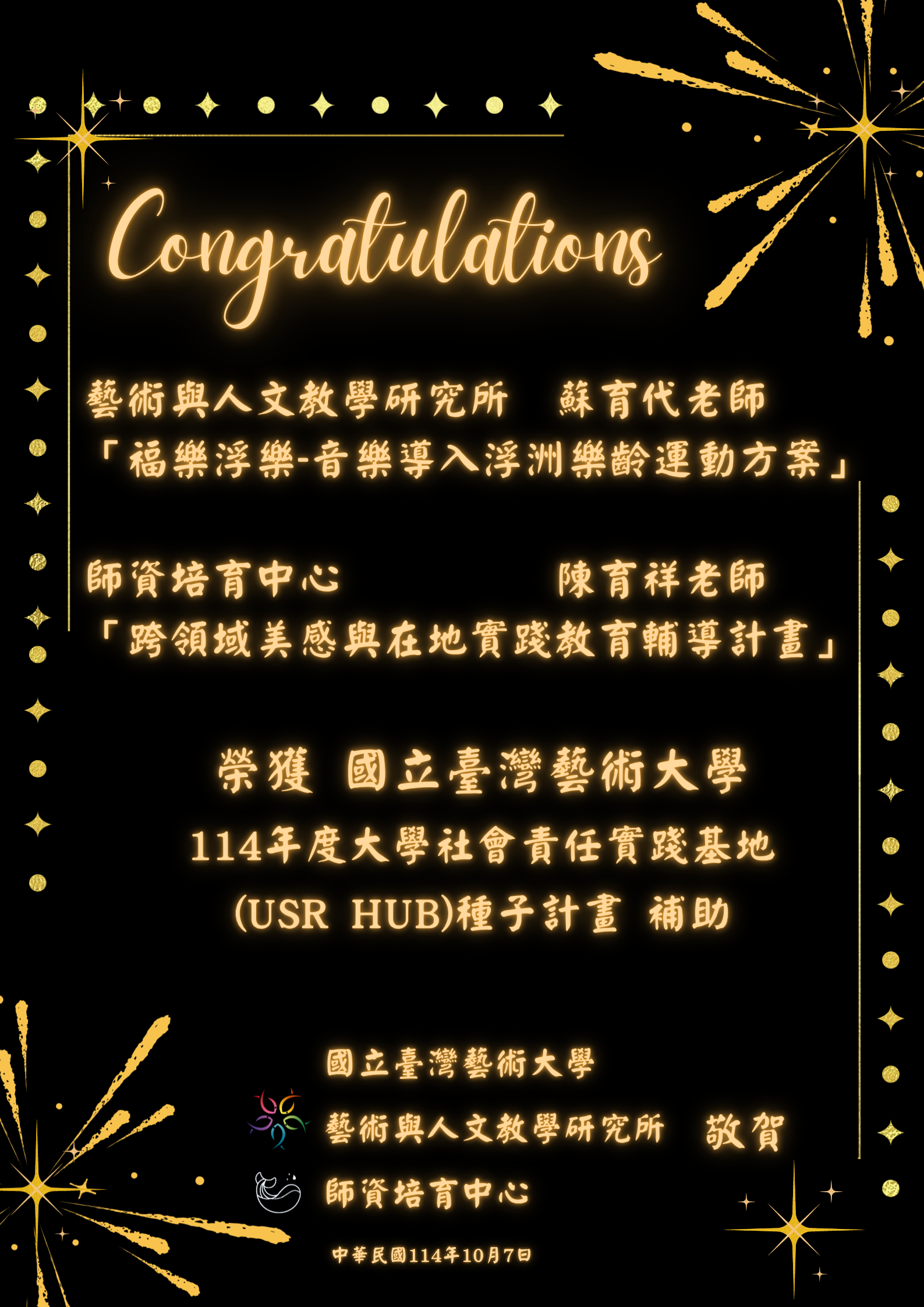 【恭賀】藝術與人文教學研究所蘇育代老師、師資培育中心陳育祥老師 榮獲本校114年度大學社會責任實踐基地(USR HUB)種子計畫補助