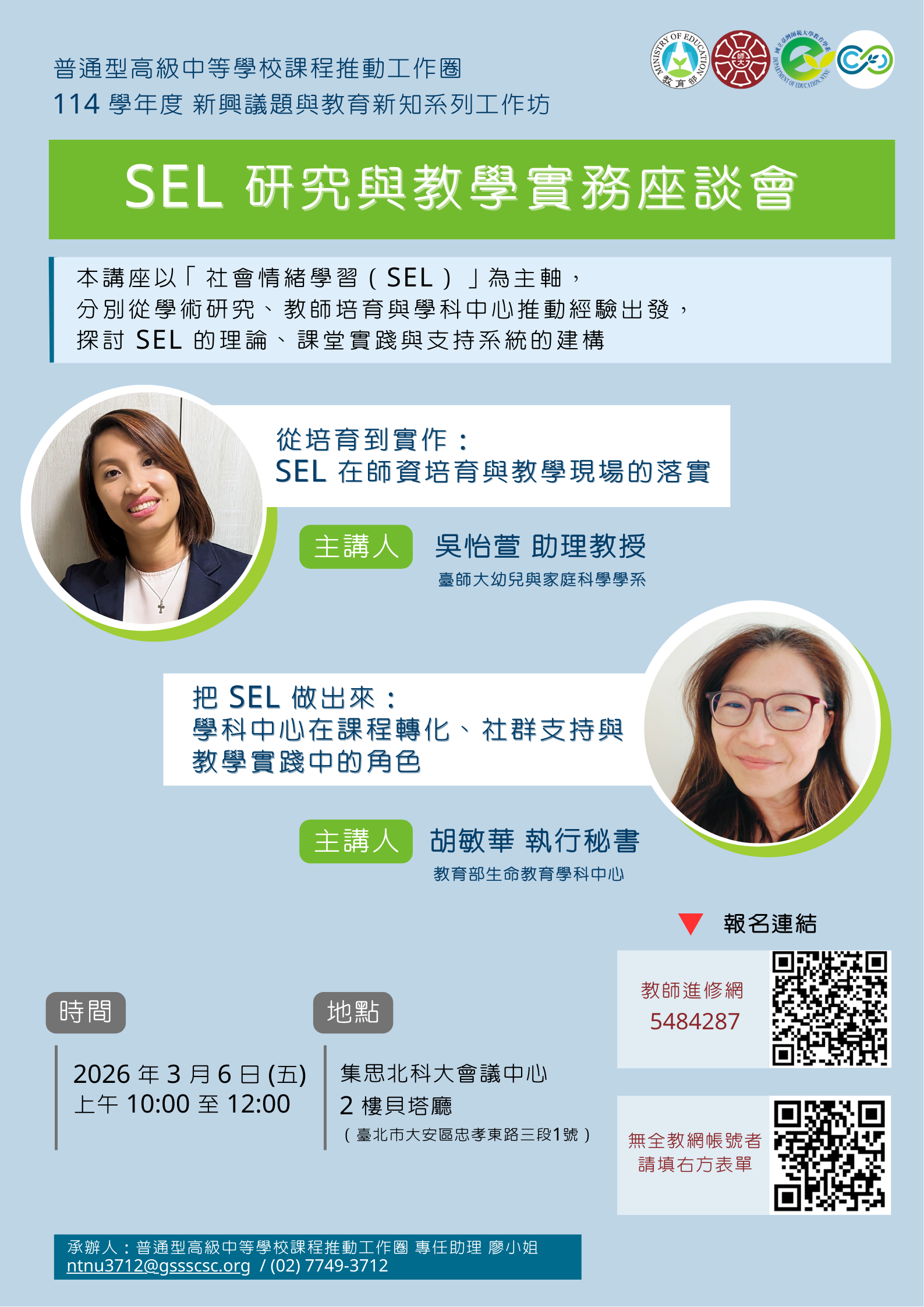 一、旨揭活動係教育部國民及學前教育署委託本校教育學系教育專業發展中心辦理,邀請來自國立臺灣師範大學幼兒與家庭科學學系吳怡萱助理教授、教育部生命教育學科中心胡敏華執行秘書,以「社會情緒學習(SEL)」為主軸,分別從學術研究、教師培育與學科中心推動經驗出發,探討SEL的課堂實踐與支持系統的建構。