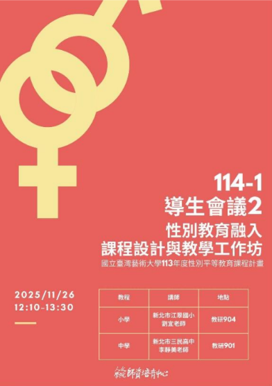 - 工作坊2場:設計互動式工作坊「性別教育融入課程設計與教學工作坊」,模擬教學情境,邀請擔任114年度國教中央性平輔導團委員之中小學教師-江翠國小劉宜老師和三民高中李靜美老師親自帶領,讓師資生實際練習推動性別平等教育的教學方法與策略,增強實踐能力。